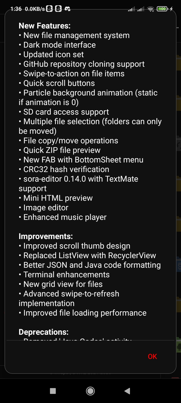 This comprehensive mobile IDE equips users with a powerful suite of features to streamline their development workflow. Navigate and manage your projects with an intuitive new file management system, complemented by a visually comfortable dark mode interface. Version control is simplified with integrated GitHub repository cloning support, enabling effortless collaboration and project management. Enhance your productivity with quick swipe-to-action functionality on file items and convenient quick scroll buttons for efficient navigation within large codebases.